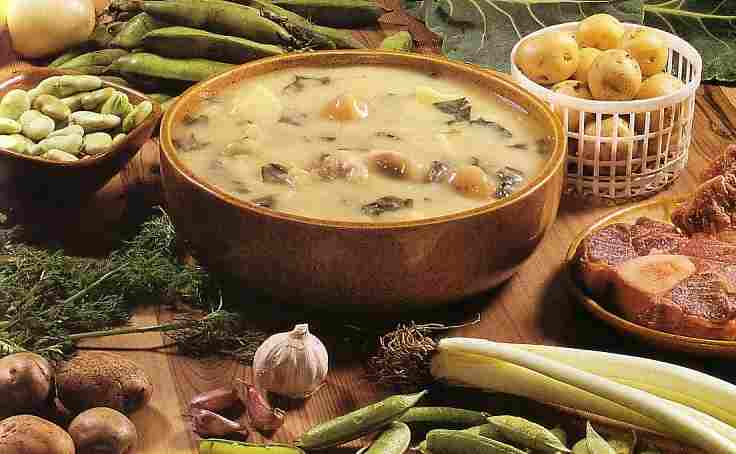 45 minutos. Se saca el espinazo del caldo y se agregan las papas sabaneras, las arvejas y las habas, se deja cocinar