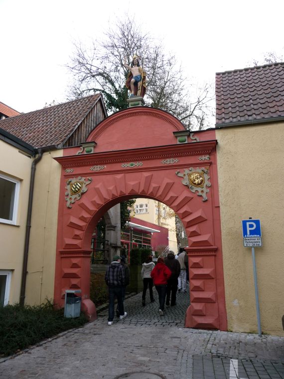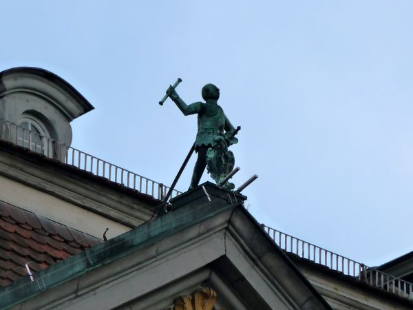 Die Figur auf dem Dach hält das Maß für eine richtige Coburger Wurst in der Hand