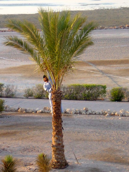 Gärtner auf einer Palme vor dem Balkon |