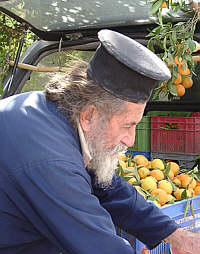 Ein Priester verkauft Apfelsinen ... und bespritzt mit Weihwassser. |